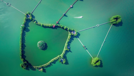 八里河懸空水上觀光玻璃天橋,全長425米,寬3米,全高55米,采用全透明特種玻璃建造,像一條蜿蜒的飛龍盤旋在八里河水面之上。將9D聲光電碎彩屏、花鳥游魚立體特效等流行科技元素與橋面結(jié)合震動,同時還有音效。 |