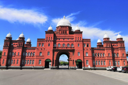 天下第一門是八里河旅游區(qū)的主園區(qū)大門。它綜合了俄、英、美三國的建筑特點,造就了具有八里河藝術(shù)風(fēng)格的建筑,也是景區(qū)的標(biāo)志性建筑。這個樓堡式大門共有13個白色圓頂,中間一個較為突出,外墻飾有猩紅色的噴砂。
