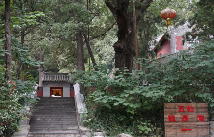 出秘魔崖,沿證果寺門前小盤道下行至南面水井,此處樹木成林,茂密非常,且均高大參天。日出東坡,光照林梢之時(shí),愈發(fā)覺(jué)得明暗濃淡別有意趣。唐詩(shī)所詠:“清晨入古寺,初日照高林”似不啻此處之景。
