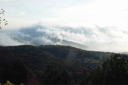 仲夏清晨,雨后天氣濕潤(rùn)時(shí),?梢(jiàn)如素如練的云霧飄浮于三山之腰,似斷還連的畫中之境。注目靜觀,或自峰后繞于嶺前,或從石隙游出升騰;有時(shí)凝固不甚流動(dòng),有時(shí)行走又很疾速。翠微山、虎頭峰間凝然不動(dòng)者居多,盧師山青石黛樹中則流走如飛者眾。概山勢(shì)高低不同所致。