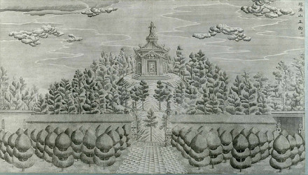 海岳開襟,是圓明園所有樓閣中最為豪華的一組建筑,海岳開襟建于圓明園中長春園的西湖內(nèi),臺基為圓形,直徑近百米,上下兩層,漢白玉石憑欄圍繞。正樓為四出軒式的三層樓閣,下層為海岳開襟,南檐題“青瑤嶼”三字;中層為得金閣,題“天心水面”四字;最上層題“乘六龍”三字;臺的四面各設(shè)牌樓一座。外側(cè)對稱布置配殿、牌坊、方亭和圓廊,是一處輝煌端莊的建筑景觀。