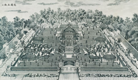 圓明園的位置在掛甲屯的北面,距暢春園約一里多路,即今北京大學(xué)的北邊,清華大學(xué)以西?滴鯐r的圓明園,里面有前湖、后湖等,其內(nèi)建有“牡丹臺”“天然圖畫”等園景。當(dāng)時圓明園還是一座藩賜園,規(guī)模不能超過皇帝的暢春園,所以建景不多,名聲也不大?珊髞黼S著乾隆皇帝的登基,清王朝的盛世的到來,在其多年陸續(xù)擴(kuò)建中,終于成為中國最宏偉的皇家園林。