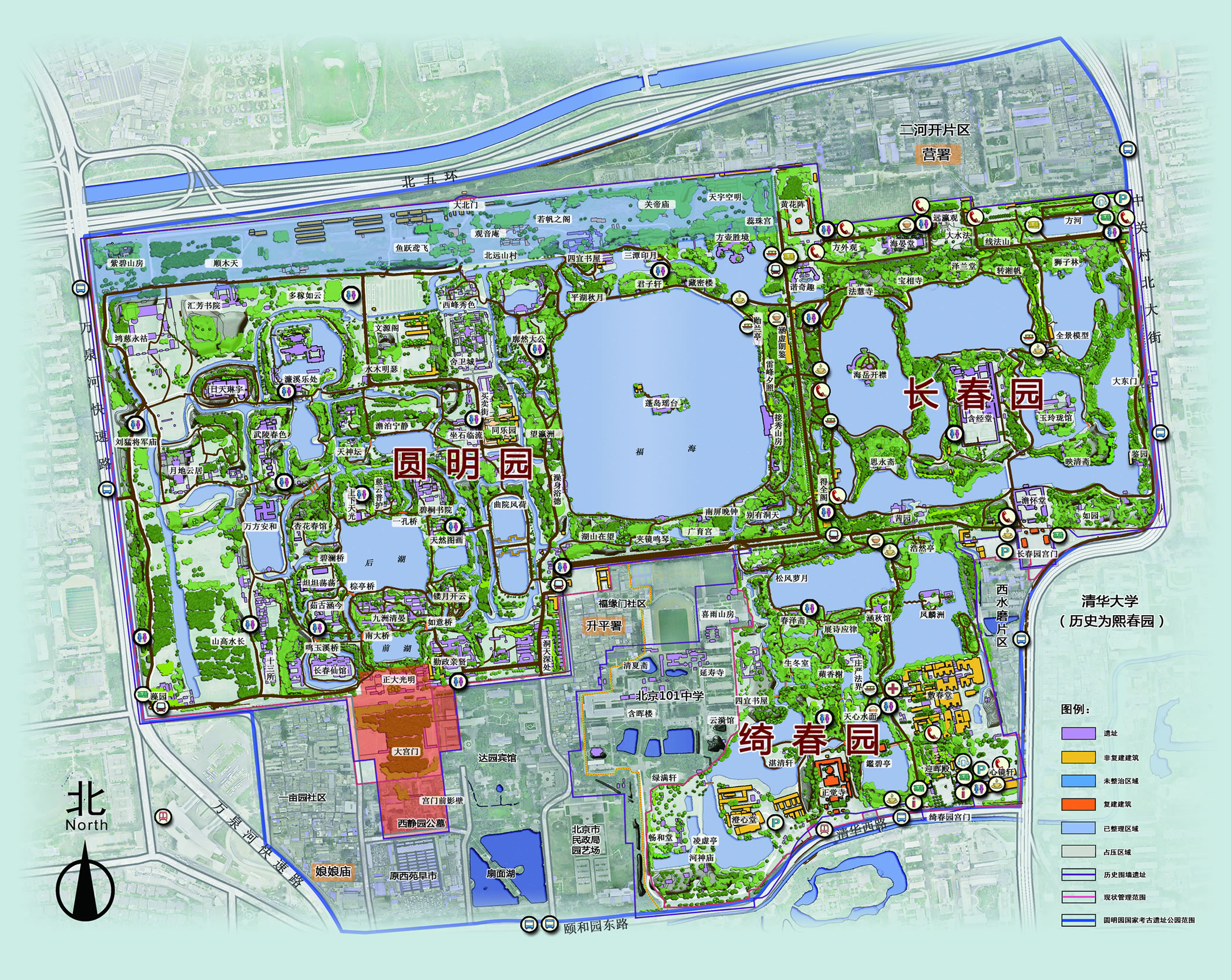 萼輝園(綺春園前身)位于暢春園的東北方向,其具體位置大致在御園北側(cè)的索戚畹園(即后來的澄懷園)以東,淑春園以北、熙春園以西,也就是綺春園(全盛規(guī)模時期)的西南部,這個區(qū)域大致為現(xiàn)一零一中學(xué)所在地。