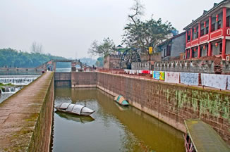 日月門:系大榮寨的四大城門之北門,門樓上有日月亭,門內(nèi)即煙雨巷,“橋橫古渡煙霞聚,寨聳雄關(guān)日月巡”。門內(nèi)有一甕形古井,深12.2米,內(nèi)設(shè)暗道通往河心,由重一噸多的石板遮蓋。該井系嘉慶年間修建的戰(zhàn)備設(shè)施,以備遭兵匪長期圍困時取水傳信之用。