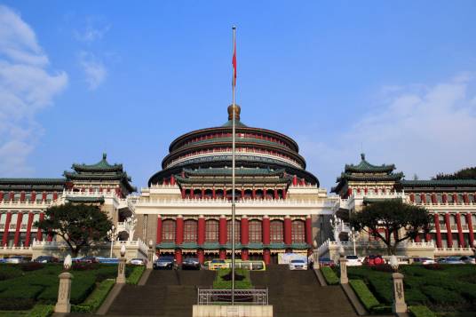 重慶市人民大禮堂,位于重慶市渝中區(qū)人民路173號,于1951年6月破土興建,1954年4月竣工,是一座仿古民族建筑群,是重慶十大文化符號,是中國傳統(tǒng)宮殿建筑風格與西方建筑的大跨度結構巧妙結合的杰作,也是重慶的標志建筑物之一。