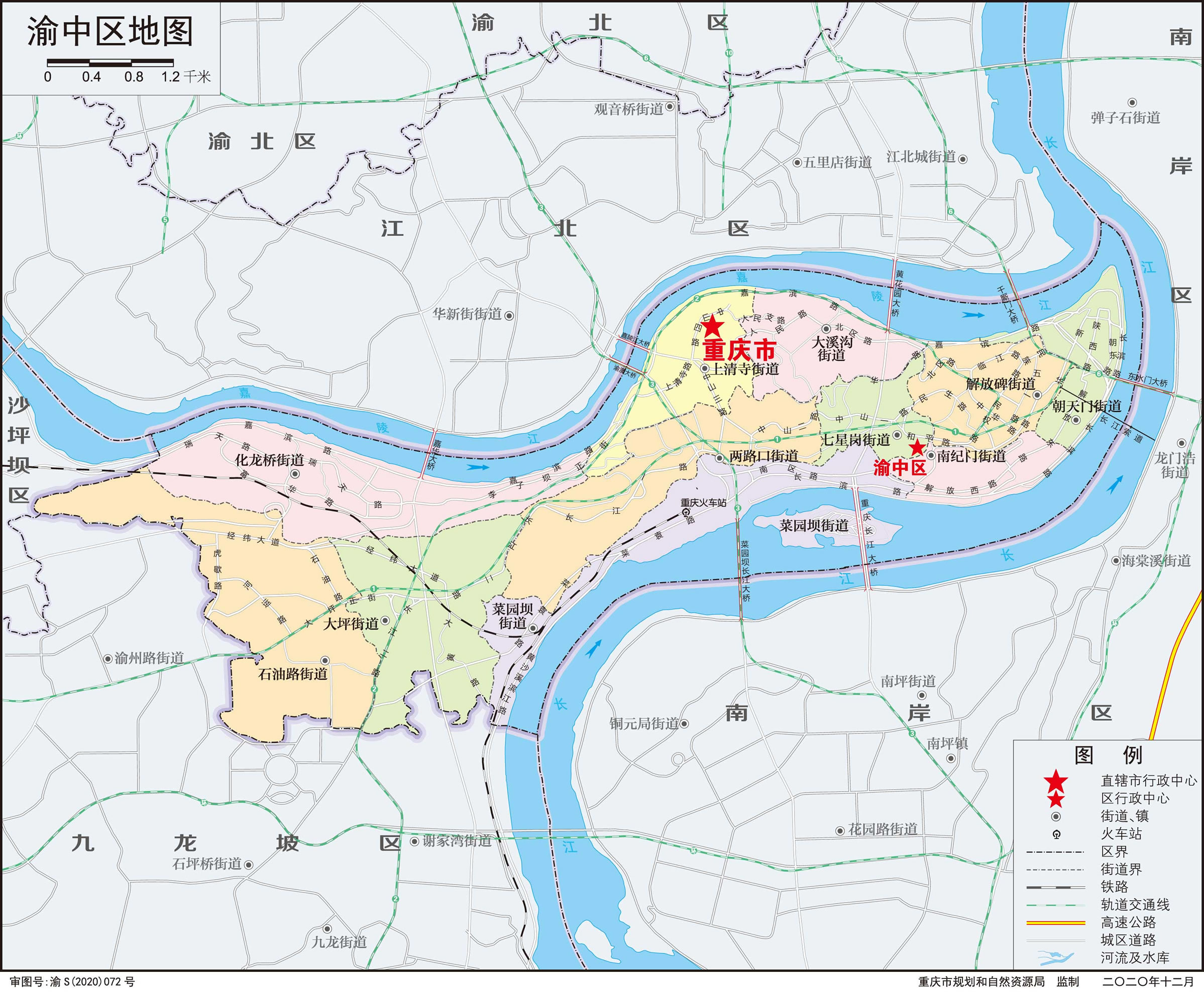 渝中區(qū)轄11個街道:七星崗街道、解放碑街道、兩路口街道、上清寺街道、菜園壩街道、南紀門街道、朝天門街道、大溪溝街道、大坪街道、化龍橋街道、石油路街道