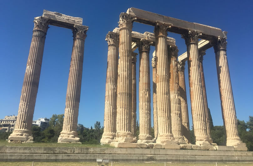 宙斯神廟 宙斯神廟位于希臘雅典衛(wèi)城東南面,是為了祭祀宙斯而建的,也是古希臘最大的神廟。宙斯神廟建于公元前470年,于公元前456年完工,由建筑師Libon設計,宙斯神像則由雕刻家菲狄亞斯負責。直到公元前86年,羅馬指揮官蘇拉(Sulla)攻占雅典,破壞了尚未完成的建筑,將一部分石柱和其他建材拆下來之后,運到羅馬。直到今天,在羅馬市中心的古羅馬廣場遺址上,還能看見它們。宙斯廟尤以象牙和黃金的塑像而聞名于世。 宙斯神廟是伊奧尼亞風格的建筑,后來改用了科林斯式石柱風格,而且一概使用大理石。整個建筑坐落在一塊205米長,130米寬的地基上,神廟本身長107.75米,寬41米,共有104根科林斯柱。每根石柱高達17.25米,頂端直徑達1.3米,約計用大理石1.55萬噸。和眾多的古希臘神廟一樣,宙斯神廟也遭受嚴重的破壞,104根柱子中僅存13根。宙斯神廟和哈德良拱門隔路相望,宙斯神廟位于路南,而哈德良拱門則位于路北,這兩座建筑都是由距今1900多年前的羅馬帝國國王哈德良時期修建的。我們已經無法看到宙斯神廟和哈德良拱門的原始形態(tài),只能通過斷壁殘垣來回憶當時的輝煌。