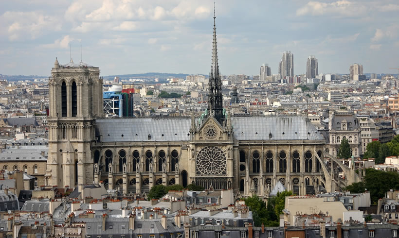 巴黎圣母院 巴黎圣母院(法語:Cathédrale Notre Dame de Paris),又名巴黎圣母主教座堂、巴黎圣母院大教堂,位于法蘭西共和國首都巴黎市中心城區(qū),地處塞納河中央西堤島上,與巴黎市政廳和盧浮宮隔河相望,為哥特式基督教教堂建筑;始建于1163年3月24日(羅馬教皇亞歷山大三世四年),是基督教支派天主教巴黎總教區(qū)主教座堂、法國首都最悠久和最具象征意義的紀念碑之一、歐洲最著名的哥特式大教堂之一、法國最具代表性的文物古跡和世界遺產之一,法國及歐洲文學文化地標建筑。 巴黎圣母院平面為長形馬蹄哥特式拉丁十字形制,總長約127米,總寬約48米,總高達96米,總建筑面積達5500平方米,總占地面積達6000平方米;西立面置有兩座鐘塔,高約69米;內部共有五個縱艙,包括一個中艙與兩側各兩個的翼艙,十字的頂部是祭壇,十字長翼是圣母院長方形主殿;東端是圣壇,后為半圓形的外墻,橫廳兩個盡段都有開門,旁置小塔;圣壇外有標志性尖塔,高96米。巴黎圣母院是世界上第一座完全意義上的哥特式教堂,建筑本體的雕刻藝術和繪畫藝術及堂內珍藏的大量藝術珍品具有極高的歷史文化價值和蜚聲中外的世界聲譽,是法國巴黎的象征,世界主流宗教基督教圣地。