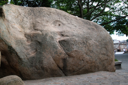 石僧拜塔位于風(fēng)動石左前側(cè)丘嶺之上,為一天然巨石,高約4米,其形酷似身披袈裟的僧人,跪地而揖,面向隔海的東門嶼文峰塔,故名,亦稱“禮僧石”。古人有詩贊曰:“怪石立山門,巋然道貌尊,折腰如合什,低首卻忘言。發(fā)禿寒花補(bǔ),衣緇積蘚皴。九年面壁者,應(yīng)是汝前身。” 有人傳言,此一“怪石”原為千百年前的一位高賢志士,因不滿朝政腐敗,天下黑暗,罷官而歸。他誓不與世浮沉,遂遁入空門,四處浪跡云游,最后涉海而入東山絕島,悟得此生路已走盡,嘆西天到底無門,唯有眼前無塵的“大浸”(即大海)是其歸宿,于是朝東面海入定,魂逐長波而去,留下法相幻化為石,即此石僧。