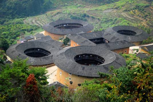 福建土樓產(chǎn)生于宋元,成熟于明末、清代和民國時期。土樓以石為基,以生土為主要原料,分層交錯夯筑,配上竹木作墻骨牽拉,丁字交叉處則用木定型錨固。福建土樓或方或圓,以圓為主,如珍珠般灑落在閩西南的綠水青山間。福建土樓遵循了“天人合一”的東方哲學(xué)理念,就地取材,選址或依山就勢、或沿循溪流,建筑風(fēng)格古樸粗獷,形式優(yōu)美奇特,尺度適當(dāng),功能齊全實用,與青山、綠水、田園風(fēng)光相得益彰,組成了適宜的人居環(huán)境以及人與自然和諧統(tǒng)一的景觀。