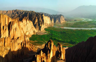 第一次看到黃河石林,便被它那氣象萬千、雄渾壯觀的景象所震撼。黃河石林與國內(nèi)其它知名景區(qū)相比,以古、奇、雄、險、野、幽見長,充分體現(xiàn)了粗獷、雄渾、樸拙、厚重的西部特色,使游客在回歸自然、領略奇異風光的同時,陶冶性情,修養(yǎng)身心。徜徉于黃河石林景區(qū),但見長河抱日,峨峰接云,石林聳奇,危崖橫斷,河映崇山,曲流回旋,平疇十里,小村安臥,老屋舊椽,新灘故道,濃蔭鋪地,綠蔽河灣,繁棗滿枝,瓜果溢香,水車唱晚,浪遏皮筏,真乃世外桃源。若沒天橋古道拾級登上南山之巔,則峰林、曲流、綠洲、戈壁盡收眼底,讓人心曠神怡。而滄桑之變中不曾嬗變的原始力量,峽谷間透出的窮靈,陽光里蕩溢的繁麗,又教人于感悟時慧眼頓開。至于觀音崖的兇險,老龍溝的深邃,盤龍洞的神奇,清涼寺的幽寂,還有環(huán)村十溝的撲朔迷離和峽谷內(nèi)景象萬千、古韻猶存的石林峰柱的磅礴氣勢,以及整個34平方公里景區(qū)內(nèi),山的夢幻、河的靈秀,綠洲的靜謚,戈壁的逍遙,不僅令人在沉思遐想中忘卻煩憂,超脫塵俗,更能引人向上,催人奮進。