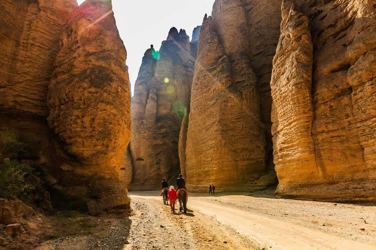 這里的石柱石筍大多高達八十至一百米之間,最高達二百多米,均由橘黃色砂礫巖構成,鬼斧神工,猶如雕塑大師之夢幻杰作。我們左行至飲馬溝入口,換乘當?shù)剞r(nóng)民裝扮得極富民俗風情的驢車前行。進入峽谷,兩邊布滿了巨大的石筍、石人、石鐘、石崖、石窟,峰回路轉,步移景變,人們將石景命名為:大象吸水、千帆競發(fā)、伴侶駝、“黃河母親”等等,其形神兼?zhèn),栩栩如生?/p>