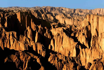 石林則依著黃河的彎轉,藐著黃河的水流,這個場面保持著一種驚心動魄的興奮,一看就是飛逝而去的千萬年啊,千萬年。老龍灣像一條長長的、波光粼粼的跑道,黃河拍打著細浪,從聳立的石林中,陡峭的巖石旁流過去,固執(zhí)地向干涸遙遠的北方挺進。風吹過,水涮過,千萬年的歲月,靈動和冥想,一路歌舞狂歡。突然一剎那就是永恒。停在那里回轉的頭型,飄飛的發(fā)絲,閃逸的裙裾一下子被動結了,面目間的笑意還沒有來及抹去。假如有一天,您也來到石林,是否會為這一片晴朗而遼闊的天空下毫無造作、天然凝就的靈魂而感動和震撼?大自然的神筆飛揚,你縱然放開想象,馳騁神思。望尖銳或圓錐狀的山峰,基部相連的簇狀,是石林發(fā)育地貌形態(tài)。只要能夠聯(lián)想到的物象,毫無例外活生生矗立在你的眼前,仰觀景慕,活靈神現(xiàn);你沒有想到的也一幕幕向你襲來,目不暇接。山峰如聚,峰嶺沸騰了一般,黃河石林以它非石非巖的特質,在這塊土地上托起一個立體的神話。雅丹、丹霞、峰林為一體的地貌奇觀寫意了恢弘的場景,刀鋒擁擠,千軍涌動,萬馬奔騰,這儼如一個拼殺的戰(zhàn)場,風行走其間鼓動著金屬碰撞的鏗鏘,它不再是一個夸張的舞臺,場面不再是一個宏大的舞池。穿越石林,我們不自主地感知黃土高原的陽剛的軀身,緘默的神態(tài),堅毅的面容,它在風雨中矗立,日復一日,從不愿放棄對大地的眷戀,對太陽的向往。