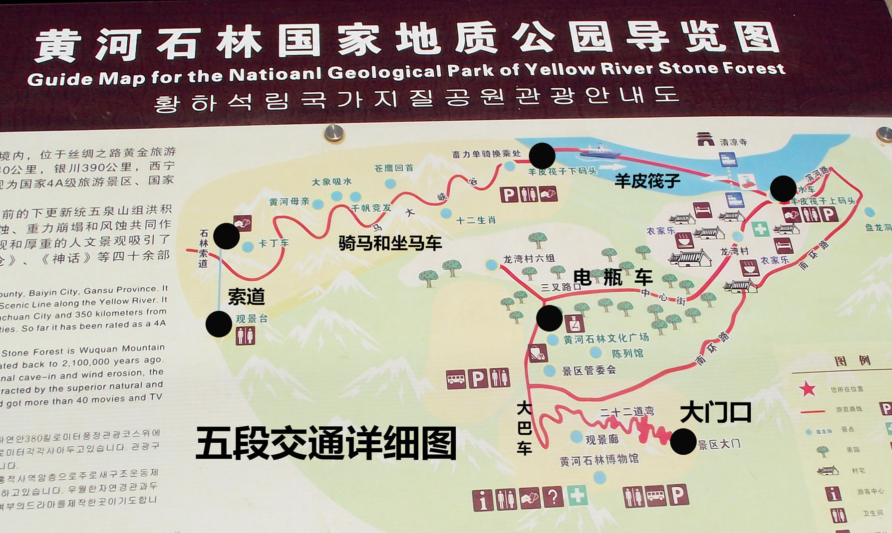 黃河石林景區(qū)將黃河、石林、沙漠、戈壁、綠洲、農(nóng)莊等多種資源巧妙結合在一起,山水相依,動靜結合,氣勢磅礴。景區(qū)適宜觀光旅游、探險獵奇、度假休閑、宗教旅游、“絲綢之路”游、會議旅游等。景區(qū)內(nèi)主要服務項目有: