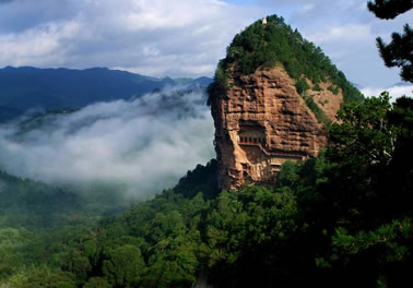 麥積山石窟坐落于西秦嶺東段,小隴山林區(qū)崇山峻嶺中,因山崖一峰突兀挺立,拔地而起,猶如農(nóng)家麥垛,故名麥積山。山高142m,頂端有隋代舍利磚塔,古老孑遺植物白皮松遍布塔周;懸崖絕壁上雕鑿著1600余年來的209個洞窟7866身泥塑石雕及1300多平米壁畫,為此麥積山石窟為中國四大石窟之一,有東方雕塑陳列館之稱。摩崖造像、凌空棧道與蒼松翠竹、赤壁丹崖相互映襯,有麥積煙雨等神奇景觀。