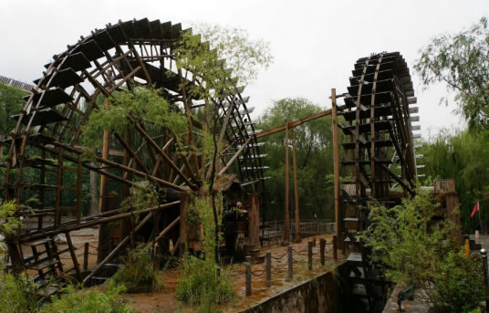 在水車廣場(chǎng)展現(xiàn)著各具特色的水車:在我們左側(cè)的是一架推水車(又稱水掛子),它依靠人力推動(dòng)水車,將水提起,傾人水渠,灌溉農(nóng)田;在我們右側(cè)的是一架腳踏水車,其原理是用力踩動(dòng)木輪,由傳動(dòng)鏈條帶動(dòng)水車,達(dá)到提水灌溉的目的;