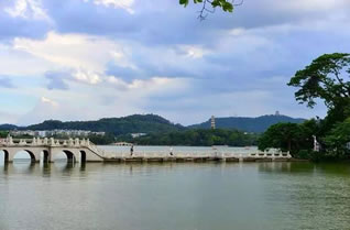 惠州西湖面積遼闊,湖岸彎環(huán)曲折,湖上洲嶼點綴、三面青山環(huán)抱。湖泊東西最寬處達4公里,南北最長達6公里,面積最大時有10平方公里,湖區(qū)面積約80平方公里。在煙波浩淼的湖面上,堤橋如帶,把湖面分割成五大部分,素有“五湖六橋”之稱。北宋大文學家蘇東坡贊惠州“山水秀邃”。這里是廣東著名的5A級國家風景名勝區(qū)和旅游勝地。
