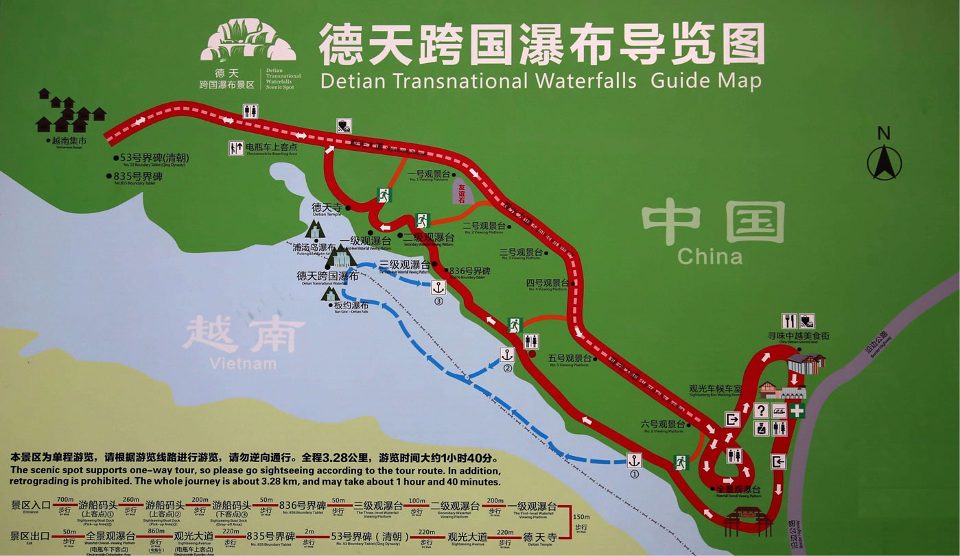 除了瀑布以外,德天景區(qū)一帶還有明仕田園風光、沙屯的多級疊瀑、奇峰夾峙的黑水河,綺麗多姿的那岸奇景,雷平石林、恩城山水、中越邊境53號界碑等景點,更有那云霧飄渺的群英會德天五百里畫廊,遍布紅棉翠竹和民居水車的田園美景。