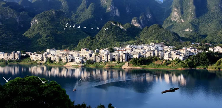 “紅水河第一灣”是國家AAAA級景區(qū),位于三石鎮(zhèn)板文村。紅水河在流經(jīng)東蘭縣板文村境內(nèi)拐了一個(gè)大彎,形成一個(gè)“U”字型的大峽谷,山環(huán)水繞,碧如玉環(huán),中間主峰如神龜靜臥,兩岸峰叢對稱排開,谷底河灘幾十個(gè)水譚或?qū)ΨQ、或連通,奇妙非常。山間林木翠綠蔥蘢,獼猴跳躍,百鳥爭鳴。在山頂上銅鼓觀景玻璃臺觀賞第一灣奇景,若在晨起碰到云霧天氣,霞光普照,霧繞神灣,幻若仙境。有詩描述:“一灣驚天下,回首造高峽,千山還壯美,奔流再出發(fā)!”該景區(qū)是紅水河的精華河段,是攝影、探險(xiǎn)、休閑度假的好地方。