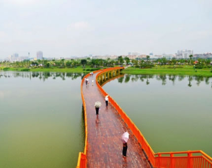梧州園博園的整體景觀結(jié)構(gòu)為“一軸九片區(qū),三廊多節(jié)點(diǎn)”。一軸,指的是西入口的入園景觀軸,從西入口的龍湖大道開始,經(jīng)由跨湖橋一直延伸到東部山體;九片區(qū),是指沿著蒼海湖的東西兩岸,帶狀分布的原始地貌各異的九大片區(qū),分別為西岸濱水景觀區(qū)、水岸林舍片區(qū),蒼海公園片區(qū)等;三廊,指的市西岸親水綠廊,東岸濱水游憩體驗區(qū),以及核心城市展示廊。而多個各具特色的景觀節(jié)點(diǎn),將有如明珠般分布在園博園各處,分別展示梧州的歷史文化、風(fēng)土人情,充分體現(xiàn)“西江明珠,嶺南新韻”的主題。