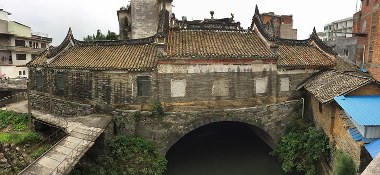 登龍橋在西河流向圭江的入口處。據(jù)資料記載,該橋始建于宋元年,全長(zhǎng)36.3米,拱跨10米,高5.5米,寬13.5米。橋面一邊為橋的通道,中間建風(fēng)雨亭,為歇山頂磚木結(jié)構(gòu);一邊建殿堂,青磚砌墻,青瓦覆蓋,硬山頂磚木結(jié)構(gòu)。頂部磚砌灰雕花脊,兩端飾鰲魚,中間為火球。殿內(nèi)墻端繪飾古壁畫,園木柱作頂柱。橋東牌坊上刻著“登龍橋”三個(gè)大字,整座建筑風(fēng)格獨(dú)特,莊重樸實(shí)。為北流八景之“龍橋夜月”所在。