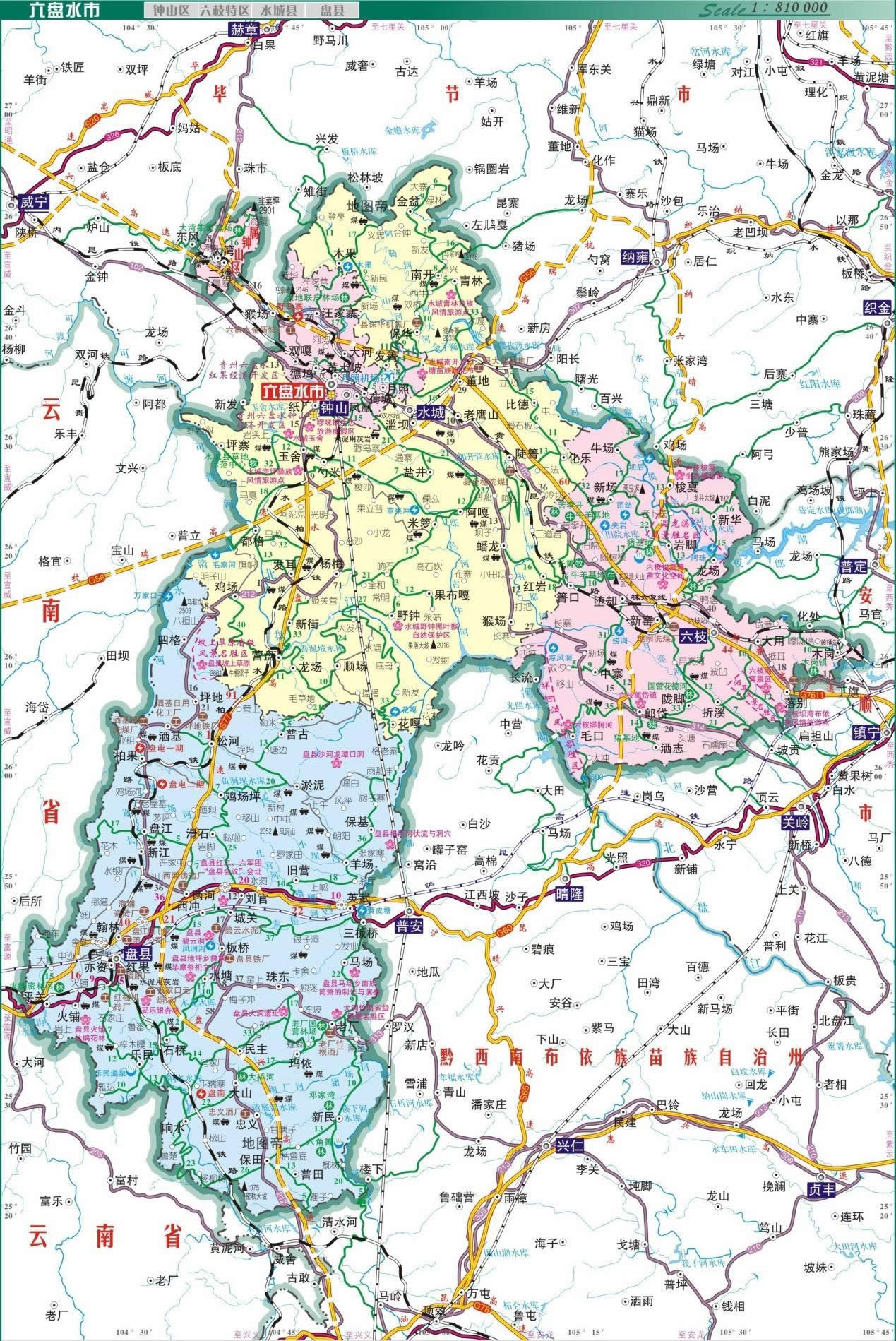 盤(pán)州市 面積4056平方千米,人口106.93萬(wàn),政府駐亦資街道鳳鳴北路1號(hào),下轄6個(gè)街道、14個(gè)鎮(zhèn)、7個(gè)鄉(xiāng)