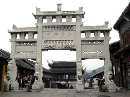青巖古鎮(zhèn)城中原有八座牌坊橫跨在石板鋪筑的大街上,如今尚存兩座百歲坊和一座貞節(jié)牌坊。定廣門內(nèi)的趙理倫百歲坊,是清道光二十三年(1843年)奉旨建造的。它是一座四柱三間、三樓四阿頂?shù)氖品,?.5米,寬約9米。精心雕琢的石牌坊,在藍(lán)天白云之中,顯得空靈。正中的橫額上,鐫刻著道光皇帝的題額,正面是“七葉衍祥”,背面是“升平人瑞”,上端有“欽賜”二字。抱柱的四對石獅子非同尋常,不是站獅,也不是臥獅或蹲獅。八頭獅子仿佛是從高山上俯沖下來,富有靈性。