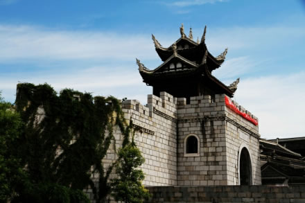 北城門又稱玄武門,為重檐歇山式頂木結(jié)構(gòu)建筑,屋頂為青灰色瓦面,泥塑脊飾,是古代欽差下達(dá)皇帝圣旨的場所,初建于明朝天啟年(1621—1624年),清順治十七年(1600年)班麟貴之子應(yīng)壽子承父職(土司)將土城墻改建為石城墻,清嘉慶三年(1789年),武舉人袁大鵬重修擴(kuò)建,是青巖古鎮(zhèn)的象征之一。