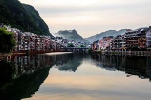 鎮(zhèn)遠(yuǎn)古鎮(zhèn),位于貴州省黔東南苗族侗族自治州鎮(zhèn)遠(yuǎn)縣,河水蜿蜒,以“S”形穿城而過,北岸為舊府城,南岸為舊衛(wèi)城。兩城池皆為明代所建,現(xiàn)尚存部分城墻和城門。城內(nèi)外古建筑、傳統(tǒng)民居、歷史碼頭數(shù)量頗多。