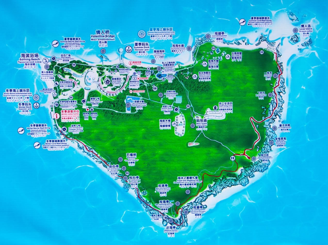 距三亞市30公里,鳳凰機場38公里,緊靠?谥寥齺喌母咚俟,位置優(yōu)越,交通便利。蜈支洲島是海南島周圍為數(shù)不多的有淡水資源和豐富植被的小島,有二千多種植物,種類繁多。