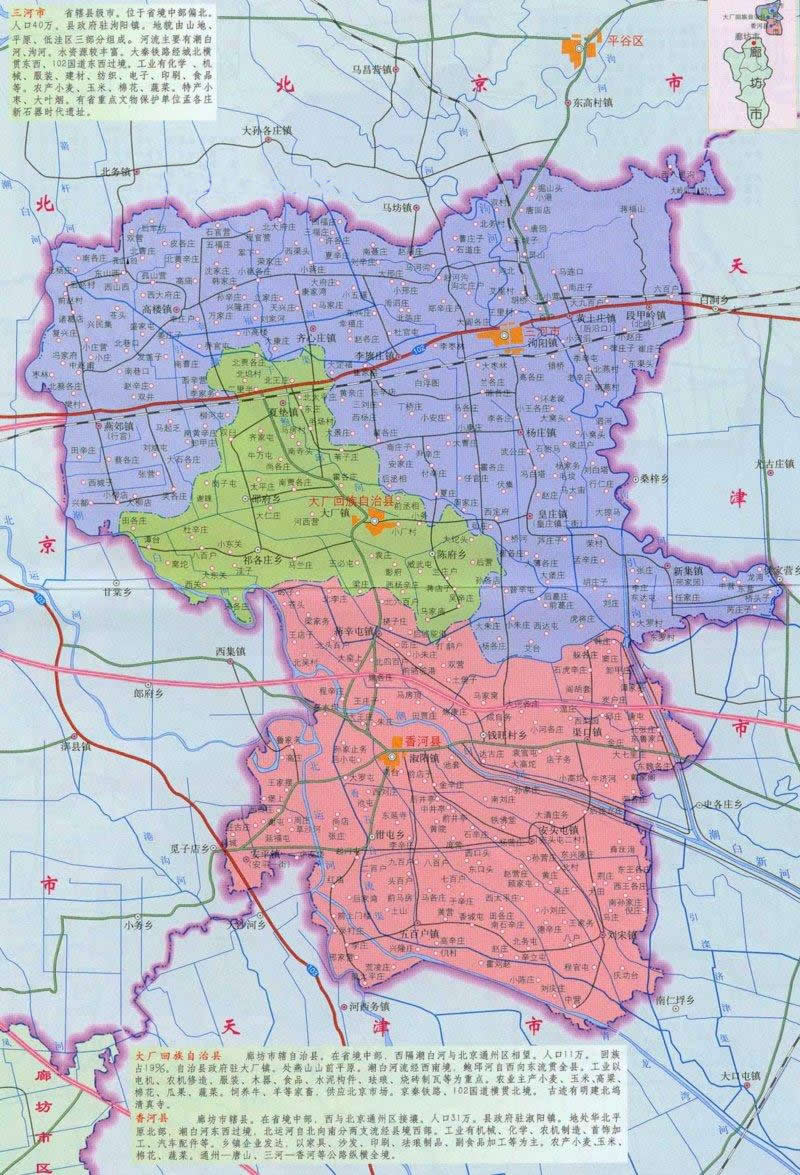 1993年經(jīng)國(guó)務(wù)院批準(zhǔn)撤縣設(shè)市,現(xiàn)轄10鎮(zhèn)2區(qū)(燕郊省級(jí)經(jīng)濟(jì)技術(shù)開發(fā)區(qū)、省級(jí)農(nóng)業(yè)高新技術(shù)園區(qū))、2個(gè)街道辦事處、395個(gè)村街。
