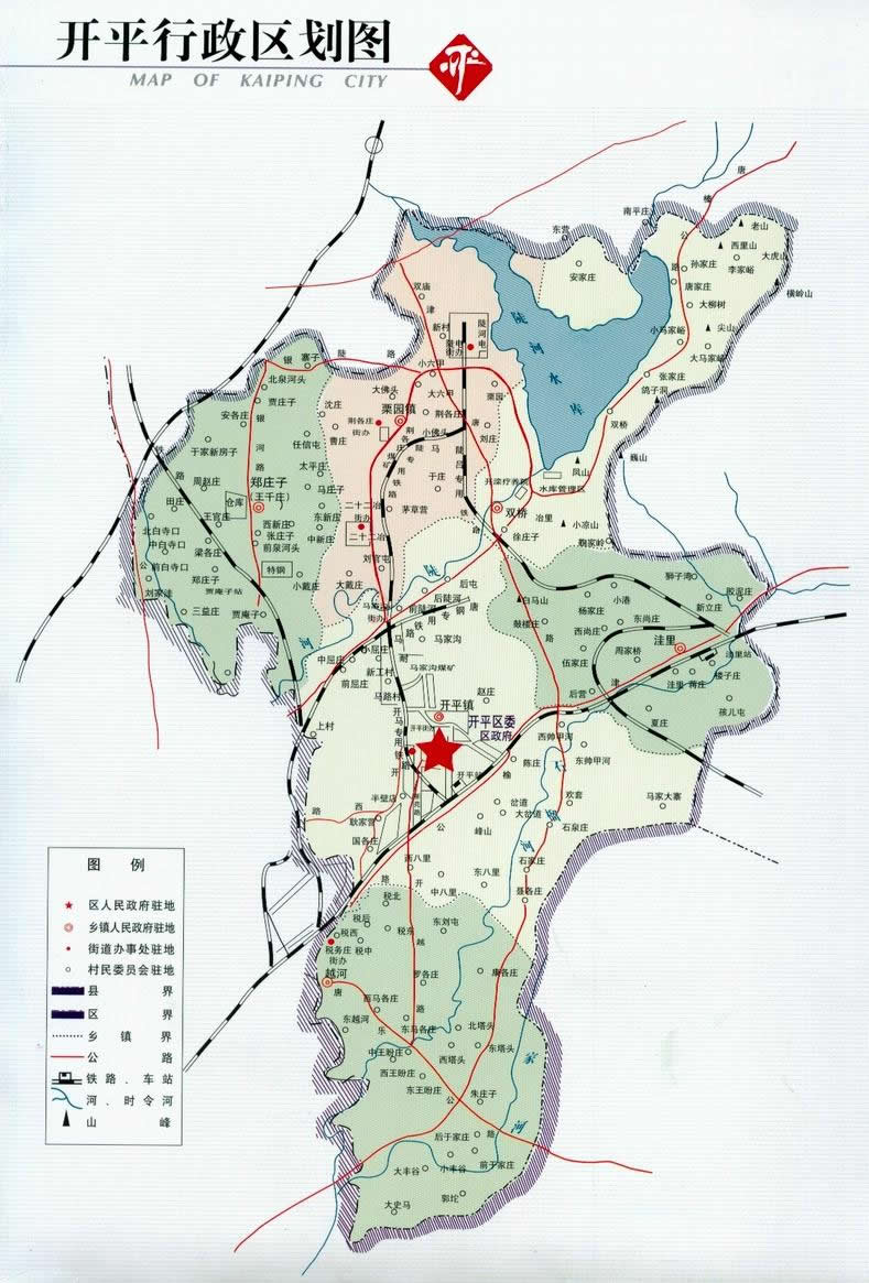 開(kāi)平鎮(zhèn) 鎮(zhèn)政府駐開(kāi)平西大街35號(hào)。面積52.79平方千米,人口5.80萬(wàn)。轄34個(gè)村委會(huì):開(kāi)平一街、開(kāi)平二街、開(kāi)平三街、開(kāi)平四街、開(kāi)平五街、開(kāi)平六街、開(kāi)平七街、東帥甲河、西帥甲河、馬家大寨、馬家溝、小屈莊、前屈莊、中屈莊、半壁店、大岔道、石泉莊、前陡河、后陡河、耿家營(yíng)、中八里、東八里、西八里、國(guó)各莊、聶各莊、石家莊、豐山、趙莊、上村、后屯、馬路、歡套、陳莊、岔道。