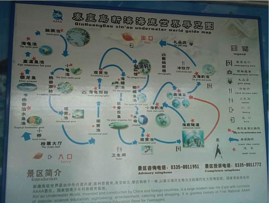 秦皇島火車站有公交車可直達(dá)景區(qū)。一期工程總投資人民幣1. 2億元,建筑面積1.3萬平方米,總儲水量約500.0000立升。主要由小池區(qū)、江豚龍宮、觸摸池、珊瑚海、雨林傳奇、企鵝館、海豹表演、海底探奇、深海之旅、科普展廳、科普教室、鳥雨林、巨蟲公園及海洋精品店、觀海鱷魚餐廳 等部分組成是集科普教育、環(huán)保教育、休閑娛樂于一體的科普教育基地。