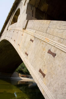 在主券上均勻沿橋?qū)挿较蛟O(shè)置5個鐵拉桿,穿過28道拱券,每個拉桿的兩端有半圓形桿頭露在石外,以夾住28道拱券,增強其橫向聯(lián)系;4個小拱上也各有一根鐵拉桿起同樣作用。