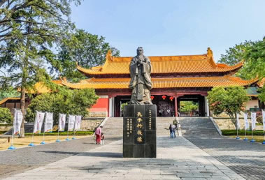 宮墻兩端各有磚坊一座,三間三拱門,中門較高大,上面有磚刻橫額,東為“德配天地”,西為“道貫古今”。這八個(gè)大字都是曾國(guó)藩所書。