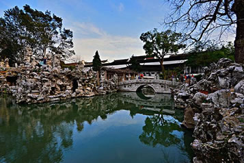 園內(nèi)水體聚中有分。聚合型的主體水池中心有亭佇立,曲橋連亭。在園西假山深處,山石做懸崖?tīng)睢R还汕迦?jīng)湖石三疊,奔瀉而下,形成了蘇州古典園林引人注目的人造瀑布。園中水景豐富,溪澗泉流,迂回于洞壑峰巒之間,隱約于林木之中,藏尾于山石洞穴。