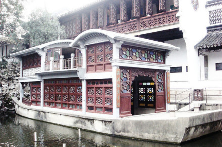 石舫,又稱(chēng)旱船,人稱(chēng)“不系舟”。位于獅子林水池西北,建于民國(guó)初年,系二十世紀(jì)最后一位園主所建。石舫中、后艙均為兩層,四周安有86扇鑲嵌彩色玻璃的和合窗。舫身四面皆在水中,船首有小石板橋與池岸相通,猶如跳板。船身、梁柱、屋頂為石構(gòu),門(mén)窗、掛落、裝修為木制。前艙聳起,屋頂呈弧形曲面,中船低平,屋頂為平臺(tái),屋艙上下二屋,有樓梯相通。其制作精巧,造型逼真,細(xì)部花飾已帶有一些西洋風(fēng)味。
