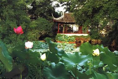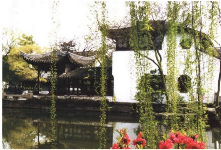 ( 4)園林景觀,花木為勝。拙政園向以“林木絕勝”著稱。數(shù)百年來(lái)一脈相承,沿襲不衰。早期王氏拙政園三十一景中,三分之二景觀取自植物題材,如桃花片,“夾岸植桃,花時(shí)望若紅霞”;竹澗,“夾澗美竹千挺”,“境特幽回”;瑤圃百本,花時(shí)燦若瑤華!睔w田園居也是叢桂參差,垂柳拂地,“林木茂密,石蘚然”。每至春日,山茶如火,玉蘭如雪。杏花盛開(kāi),“遮映落霞迷澗壑”。夏日之荷。秋日之木芙蓉,如錦帳重疊。冬日老梅偃仰屈曲,獨(dú)傲冰霜。有泛紅軒、至梅亭、竹香廊、竹郵、紫藤塢、奪花漳澗等景觀。至今,拙政園仍然保持了以植物景觀取勝的傳統(tǒng),荷花、山茶、杜鵑為著名的三大特色花卉。僅中部二十三處景觀,百分之八十是以植物為主景的景觀。如遠(yuǎn)香堂、荷風(fēng)四面亭的荷(“香遠(yuǎn)益清”,“荷風(fēng)來(lái)四面”);倚玉軒、玲瓏館的竹(“倚楹碧玉萬(wàn)竿長(zhǎng)”,“月光穿竹翠玲瓏”);待霜亭的桔(“洞庭須待滿林霜”);聽(tīng)雨軒的竹、荷、芭蕉(“聽(tīng)雨入秋竹”,“蕉葉半黃荷葉碧,兩家秋雨一家聲”);玉蘭堂的玉蘭(“此生當(dāng)如玉蘭潔”);雪香云蔚亭的梅(“遙知不是雪,為有暗香來(lái)”);聽(tīng)松風(fēng)處的松(“風(fēng)入寒松聲自古”),以及海棠春塢的海棠,柳陰路曲的柳,批把園、嘉實(shí)亭的批把,得真亭的松、竹、柏等等。