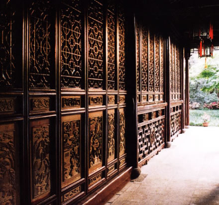 秫香館:秫香,指稻谷飄香。此處以前墻外皆為農(nóng)田,豐收季節(jié),秋風(fēng)送來(lái)一陣陣稻谷的清香,令人心醉,館亦因此得名。秫香館為東部的主體建筑,面水隔山,室內(nèi)寬敞明亮,長(zhǎng)窗裙板上的黃楊木雕,共有48幅,雕鏤精細(xì),層次豐富,栩栩如生。落地長(zhǎng)窗加上精致的裙板木雕,把秫香館妝點(diǎn)得古樸雅致,別有情趣。