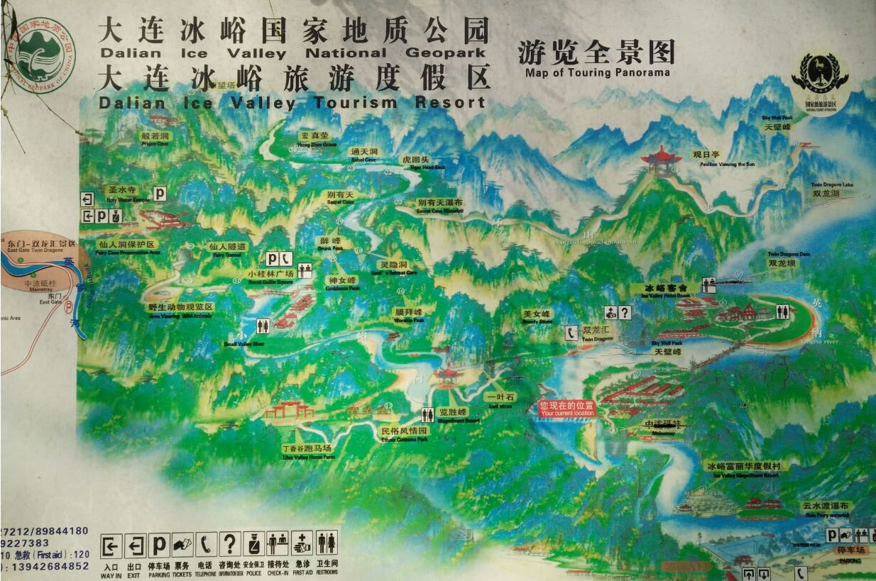 所謂北溝,指的是英納河流經(jīng)的溝谷,而南溝則是指小峪河流經(jīng)的溝谷,冰峪的主要景點大都被兩條河貫穿著。英納河是滿語“因納輝”的音譯,意為美麗的地方,河長94.9公里,是莊河境內(nèi)最長的一條河流。莊河市的淡水資源占大連地區(qū)首位,而英納河的淡水則在莊河市的首位。為了增加碧流河水庫的容量,大連市已于2001年5月引英納河的水進(jìn)入了碧流河水庫。據(jù)化驗,在英納河水中含有23種微量元素,具有抗癌和健身爽膚等多種功效。冰峪石林地貌比較集中,山峰連成一片,而有的地方卻是孤峰突兀,頗有點小桂林的味道。又有人稱其為“天然大盆景園”,因為景區(qū)內(nèi)有“大象吸水”、“金雕”、“豬馱龜”等許多奇景。