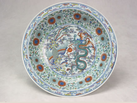 清雍正款斗彩龍鳳大盤(pán):此盤(pán)為白地斗彩大盤(pán),盤(pán)內(nèi)飾斗彩龍鳳戲珠紋,一條行云五爪飛龍,龍身蜿蜒矯健,鳳舞展翅穿于祥云之間,呈龍飛鳳舞圖案。盤(pán)外飾海水江崖,壽山福海。壽山上靈芝盛開(kāi),云蝠翩翩。底“大清雍正年制”六字兩行雙圈青花楷書(shū)書(shū)款。整個(gè)大盤(pán)胎質(zhì)細(xì)膩,釉色純正,造型規(guī)矩,為清宮祝壽時(shí)的御用器皿。