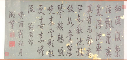 清弘歷行書(shū)對(duì)雨詩(shī)卷:此書(shū)卷作于乾隆十八年(1753)。綠色片金蠟箋紙。引首騎縫鈐篆書(shū)朱文“石渠寶笈所藏”方印,行書(shū)寫(xiě)自作五言律詩(shī)一首,全詩(shī)為“細(xì)灑復(fù)絮注,飄蒲爽氣浮。洗車(chē)真有雨,壽扇果知秋。池轂紋如疊,檐琴韻轉(zhuǎn)悠。晚來(lái)云影散,更喜素蟾流。”詩(shī)后自題“對(duì)雨作”,后署款“癸酉新秋月,御筆”。