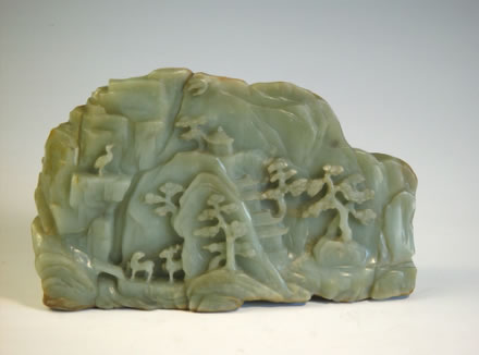 清青玉巧琢樓閣松鶴山子:青玉質(zhì)地,外帶棕黃色皮殼,總體呈立體山形。一面以凸雕、透雕等技法琢成山峰、瀑布、小橋、松樹(shù),樹(shù)后掩映一座古寺,檐脊重重,清幽雅致,寺前一老者攜抱琴童子徐徐而行;另一面以凸雕、透雕等技法琢成山石、瀑布、樓閣、松樹(shù)等圖案,山下兩鹿一前一后,如影隨行;山上雙鶴相望呼應(yīng),寓有“鶴鹿同春 部山石上另刻有御題《朱砂峰》五言詩(shī)一首。山子下附有透雕木座。