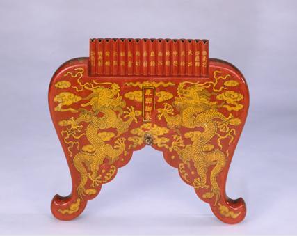 清乾隆款朱漆描金云龍紋排簫:通體遍涂朱紅彩漆,大部分為木制,刻成獸腿開(kāi)叉形狀,腿下部雕成云頭形狀。雙面均描金繪二龍戲珠、浮云、火焰圖案,在正面火焰珠位置為長(zhǎng)條方池,內(nèi)有金漆楷書(shū)“乾隆八年制”年款。排簫上部為單排十六根竹管,用于吹奏之用,管上正面各以金漆書(shū)寫(xiě)楷書(shū)律名,從左至右依序?yàn)椤氨兑膭t”“倍無(wú)射”“黃鐘”“太簇”“姑洗”“蕤賓”“夷則”“無(wú)射”“應(yīng)鐘”“南呂”“林鐘”“仲呂”“夾鐘”“大呂”“倍應(yīng)鐘”“倍南呂”。排簫底部系有一條五彩流蘇。