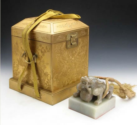 清世宗憲皇帝謚寶:此寶為嘉慶四年(1799)清宮內(nèi)府遵旨由舊寶改鐫而成。寶上部為單體蹲龍紐,描金,紐上系明黃絲繩。謚寶文字為滿(mǎn)、漢文合璧,均為朱文,右側(cè)為漢文篆書(shū)四行,左側(cè)為滿(mǎn)文篆書(shū)四行。其文為“世宗敬天昌運(yùn)建中表正文武英明寬仁信毅睿圣大孝至誠(chéng)憲皇帝之寶”。謚寶外包明黃織金四則團(tuán)花暗云紋錦包袱皮,用雙層龍鳳紋金漆套盒盛裝。該寶于嘉慶四年改鐫后由北京送至盛京太廟尊藏,清末民國(guó)時(shí)期存于沈陽(yáng)故宮崇謨閣內(nèi)。