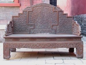 崇政殿室內(nèi)的寶座、屏風(fēng)等陳設(shè),并非清太宗時(shí)期的原貌,而是乾隆十二年(1747年)根據(jù)皇帝的旨意重新設(shè)計(jì)制做的,堂陛之內(nèi)的屏風(fēng)寶座,是乾隆特命仿北京故宮乾清宮所用加以縮小精心制作的,寶座、屏風(fēng)各以九條龍做為主要裝飾,全部罩以金漆,體現(xiàn)其唯一的使用者──皇帝的無(wú)上尊嚴(yán)。屏風(fēng)上的四言十二句銘文,與乾清宮屏風(fēng)上的完全相同 ,是康熙皇帝從古代經(jīng)書(shū)中摘出,做為自己和后世皇帝治理國(guó)家的座右銘鐫刻在御座之旁的。陳設(shè)在龍椅前后的鶴式燭臺(tái)、熏爐、塔式香亭、 端、“太平有象”等,都是乾隆年間宮中精制的琺瑯禮器,專(zhuān)用于皇帝御座周?chē),既為熏香之用,也有?qū)邪諏吉的寓意,使得“真龍?zhí)熳印迸R朝理政之處更具有莊嚴(yán)神圣的氣氛。乾隆、嘉慶、道光幾位皇帝東巡盛京期間,都曾坐在這里接受群臣的朝賀叩拜,慶祝自己祭陵大典的成功。