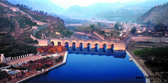 九門口長(zhǎng)城:坐落在遼寧省綏中縣李家鄉(xiāng)新臺(tái)子村境內(nèi),距山海關(guān)15公里,全長(zhǎng)1704米。其南端起于危峰絕壁間,與自山海關(guān)方向而來的長(zhǎng)城相接。自此,長(zhǎng)城沿山脊向北一直延伸到當(dāng)?shù)氐木沤幽习,在寬達(dá)百米的九江河上,筑起規(guī)模巨大的過河城橋,以此繼續(xù)向北逶迤于群山之間。“城在水上走,水在城中流。”便是人們對(duì)九門口長(zhǎng)城的形象描述。