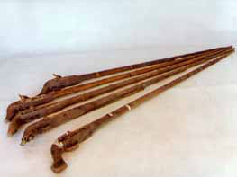 拐杖刀:俗稱“二人奪”,長(zhǎng)約90厘米。表面上看呈拐杖型,木質(zhì)。但實(shí)際上,其前面是可以斷開的,拔出外鞘,里面是一個(gè)刺刀。這是抗日斗爭(zhēng)初期,東滿游擊隊(duì)和當(dāng)?shù)厝罕娪脕韺?duì)付敵人的秘密武器。是當(dāng)時(shí)很流行很實(shí)用的武器。