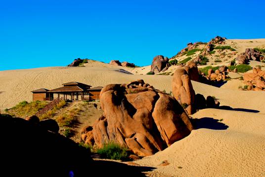 赤峰市西拉沐淪河兩岸,是著名的科爾沁沙地的組成部分,有“八百里瀚海”之稱。翁牛特旗的其甘、布日敦、勃隆克山等地,是典型的科爾沁沙地發(fā)育區(qū)。到此旅游,既可以一睹“長河落日圓,大漠孤煙直”的沙漠風(fēng)采,又可以體味沙漠與綠洲、湖泊相生相伴的沙地獨(dú)特景觀。