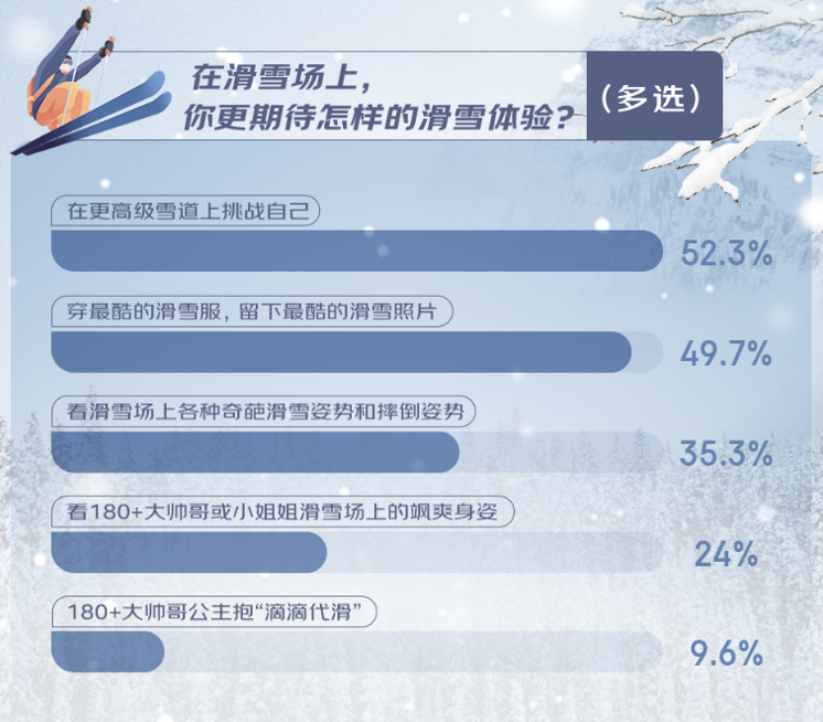 滑雪運(yùn)動的持續(xù)“擴(kuò)圈”,也讓滑雪愛好者們對于滑雪體驗的期待日益多元。超半數(shù)人希望在更高級的雪道上挑戰(zhàn)自我,感受速度與激情的碰撞;有49.7%的人期待穿上最酷的滑雪服,留下最炫的滑雪照片;還有24%的人表示來雪場期待看到帥哥、美女的颯爽滑雪身姿。